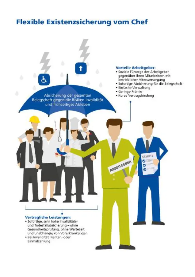 TEAM® - Team Existenz Absicherungsmodell um neue Leistungsmerkmale. Das Produkt richtet sich an Arbeitgeber, die ihre Mitarbeiter gegen existenzielle Risiken durch frühzeitiges Ableben und Invalidität absichern und ihrer Fürsorgepflicht nachkommen möchten. Ab sofort können Arbeitgeber für ihre Mitarbeiter auch Einmalzahlungen anstelle einer Rentenzahlung im Falle einer Invalidität vereinbaren. Es wird dann einmalig die vereinbarte Summe - in der Regel bis zu 250.000 EUR pro Mitarbeiter - ausgezahlt. Neben einer einjährigen beitragsorientierten Leistungszusage, können nun auch Leistungszusagen und bestehende Anwartschaften bereits ausgeschiedener Mitarbeiter mit TEAM® abgesichert werden. Außerdem werden künftig Leistungen aus der gesetzlichen Kranken- bzw. Rentenversicherung nicht mehr zu 100 Prozent angerechnet. Stattdessen wird eine Obergrenze von 60 Prozent des letzten Bruttoeinkommens für die Leistungen aus der gesetzlichen Kranken- und Rentenversicherung und TEAM® sowie Teile des Einkommens nach Invalidität festgelegt. Scheiden Mitarbeiter aufgrund einer Invalidität aus dem Unternehmen aus, bleibt der Todesfallschutz bestehen, sofern der Arbeitgeber die Beiträge hierfür an den Versicherer entrichtet.