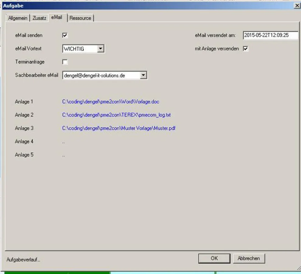 Mit dem Modul PME Com hat der Planer die Möglichkeit, an alle verplanten Ressourcen eines Einsatzes automatisiert eine eMail bzw. eine Terminanfrage zu versenden. Diese kann ergänzt werden durch eine PDF Anlage, die frei definierbar ist und z.B. eine Arbeitsanweisung, ein Auftragsformular oder ähnliches sein kann.