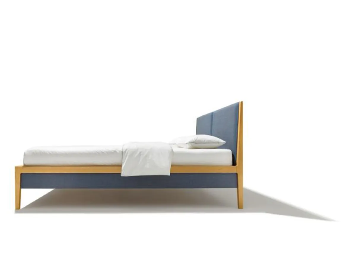 Betten mit im Material abgesetzten Seiten, wie bei dem Bett mylon des österreichischen Naturholzspezialisten TEAM 7, wirken trotz komfortabler Matratzenhöhe schlank und elegant. Ein zusätzliches Polsterhaupt rückt die feine Struktur der Holzkonstruktion, in den Fokus und schafft in Kombination mit natürlichen Materialien das Gefühl von Geborgenheit. Stoffbezüge aus hochwertiger Wolle sind hervorragende natürliche Temperatur- und Feuchtigkeitsregler. Bei dem mylon sind sie darüber hinaus abnehmbar und können leicht gereinigt werden. Das Bett ist sowohl in Normalhöhe als auch in Komforthöhe erhältlich. Es ist komplett metallfrei konstruiert, formaldehydfrei verleimt und mit reinem Naturöl veredelt. So wird ein gesundes Raum- und Schlafklima geschaffen und die Schlafstatt in ihrem harmonischen Wechselspiel aus Form und Material zum Entschleuniger für Seele und Körper.