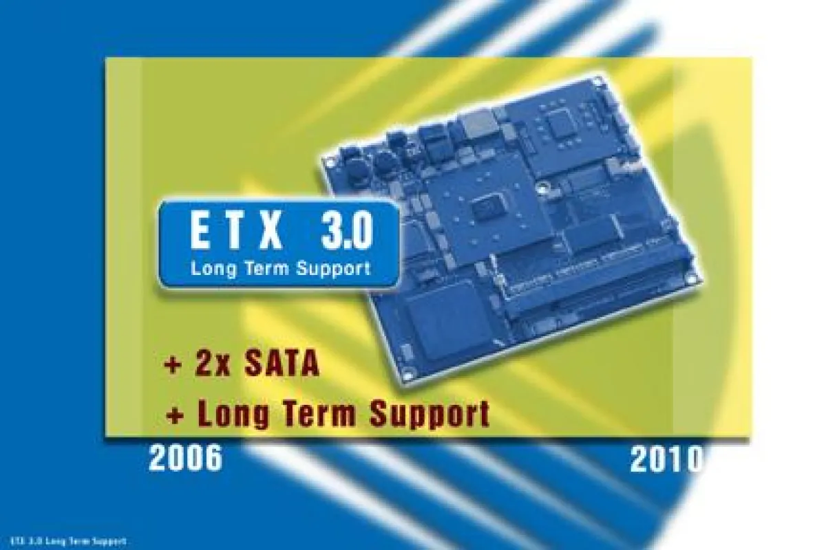 (openPR) Eching, 22. März 2006 – Die Spezifikation ETX 3.0 zur Steigerung der Attraktivität und Untermauerung des „ETX Long Term Supports“ ist mit Wirkung zum heutigen Datum vom ETX Konsortium verabschiedet worden. Sie wird in Kürze zum Download unter www.etx-ig.org bereit stehen. Als wesentliche Erweiterungen wurde 2 x SATA implementiert, wobei ETX 3.0 Computer-on-Module 100% abwärtskompatibel zu ETX Vorgängerspezifikationen sind. Die Integration von 2 x SATA wurde durch SATA-Stecker auf dem ETX-Modul selbst umgesetzt, sodass existierende Baseboard-Designs nicht verändert werden müssen um SATA-Festplatten nutzen zu können. ETX 3.0 definiert darüber hinaus auch die USB 3.0 Kommunikationen über die existierenden ETX Steckverbinder.