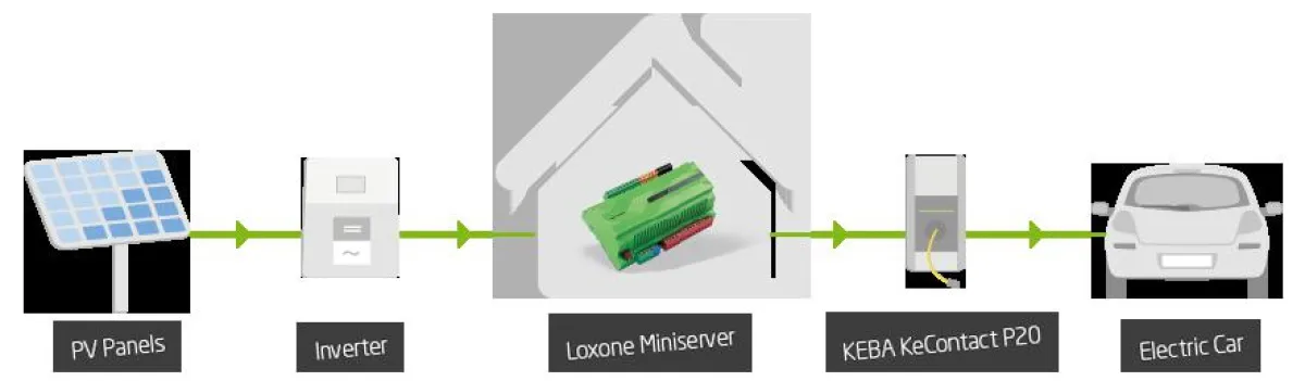 Der Loxone Miniserver kommuniziert permanent mit der KEBA Wallbox und nutzt präzise und aktuelle Daten aus der Energieproduktion, um zum Beispiel Verbraucher im Haus auszuschalten und die Energie für die Ladung des Fahrzeuges zu nutzen. Auch Informationen über den Energieverbrauch und den Ladestatus des Elektrofahrzeugs lassen sich jederzeit abrufen.