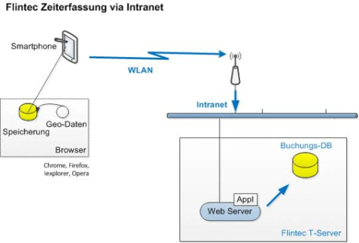 Die Datenübertragung zwischen den geografisch verteilten Smartphones und dem Flintec T-Server erfolgt über WLAN ins Intranet erfolgen. Die für das Intranet zuständige T-Server Instanz, ein Web-Server, ist nur intern sichtbar.
