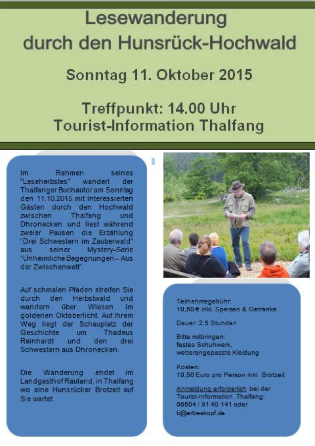 Der Leseherbst beginnt am Sonntag den 11.10.2015 um 14:00 Uhr mit einer Lesewanderung durch den herbstlichen Hochwald zwischen Thalfang und Dhronecken. Michael E. Vieten liest während zweier Pausen die Erzählung “Drei Schwestern im Zauberwald” aus seiner Mystery-Serie …