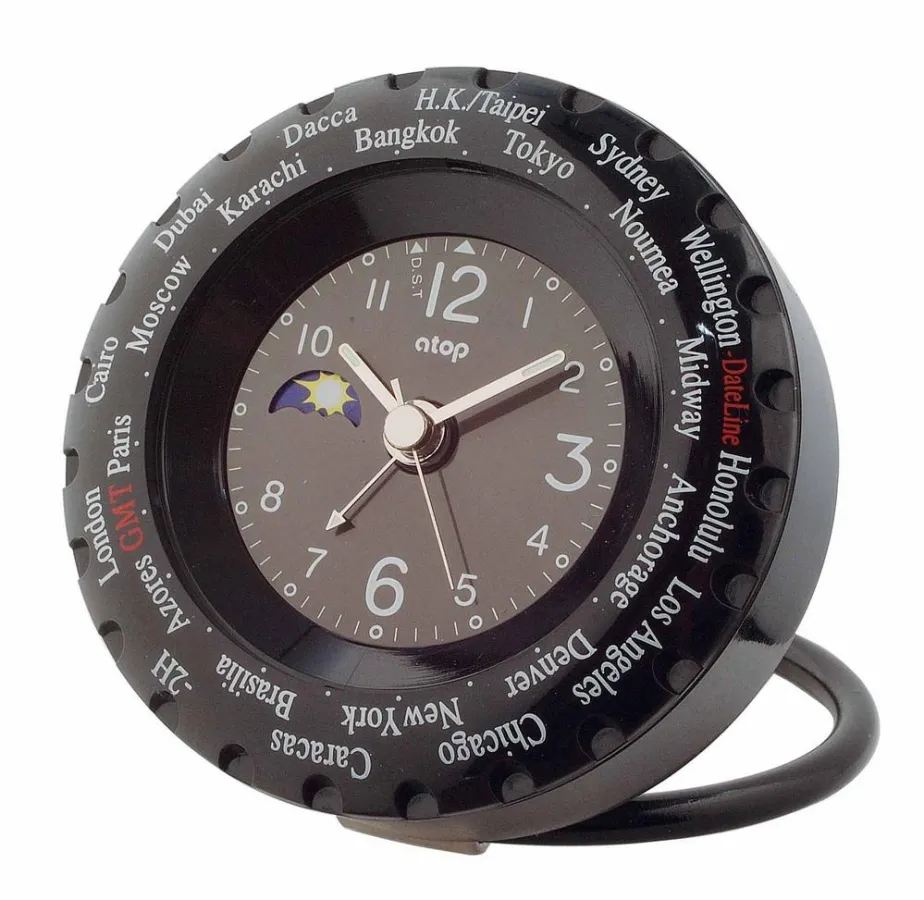 Der ATOP WTA-5 ist ein Reisewecker mit einem ganz besonderen Extra. Er nutzt eine patentierte Technik, um sich auf die aktuelle Zeitzone anzupassen. Zu diesem Zweck reicht bereits ein Dreh am Gehäuse aus, um die Krone auf die richtige Zeitzone zu drehen. Automatisch dreht sich der Stundenzeiger mit. So einfach ist es, den Wecker an die Zeit an einem neuen Ort einzustellen. Heute Berlin, morgen Los Angeles, übermorgen Kairo: Der ATOP WTA-5 ist auf alle Eventualitäten vorbereitet und nennt sogar die Namen der wichtigsten Weltstädte auf dem Gehäuse, sodass es ganz besonders simpel ist, die passende Zeitzone einzustellen.
