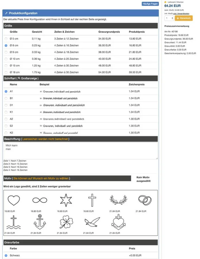 Als erstes dieser neuartigen Module wurde in Zusammenarbeit mit Navigator Handels GmbH ein Gravur Modul mit dynamischen Parametern entwickelt. In einer ersten Versionen werden Bilder, Texte, Farben, Schriftarten und Geschenkverpackungen integriert. Alle Parameter arbeiten perfekt miteinander, so das der Kunde stets aktuelle Preise und Konfigurationen sieht.
