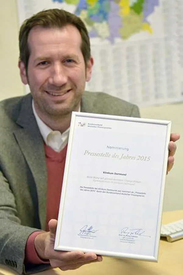 im Rennen um die „Pressestelle des Jahres 2015“ in der Kategorie „Politik/Verwaltung“. Das DLR gewann aber letztlich den renommierten Preis, v.a. für die PR-Arbeit rund um die spektakuläre Landung der Raum-sonde „Philae“ auf einem Kometen Ende 2014; die Landung wurde seinerzeit sogar von US-Präsident Barak Obama per Twitter gelobt. Vertreter der Jury, die aus hochkarätigen Experten der Pressesprecher- und PR-Szene in Deutschland bestand, würdigten zugleich die engagierte Arbeit der Pressestelle des Klinikums, die es neben dem „Bundesamt für Migration und Flüchtlinge“ in die bundesweite Top-Shortlist „Politik/Verwaltung" geschafft hatte. Erstmals war ein Krankenhaus so weit gekommen.
