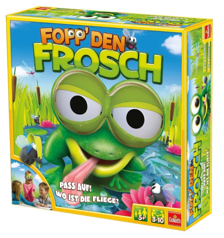 „Augen auf“ heißt es bei Fopp den Frosch. Bei dem lustigen Aktionsspiel für Kinder ab sechs Jahren ist ein Spieler der Frosch. Er trägt eine ulkige Glupschaugen-Brille, die schon vor Spielbeginn für ordentlich Gelächter sorgt. Nun soll er Fliegen sammeln, aber die Glupschaugen öffnen sich nur ab und zu und die Mitspieler haben die Brummer untereinander versteckt.