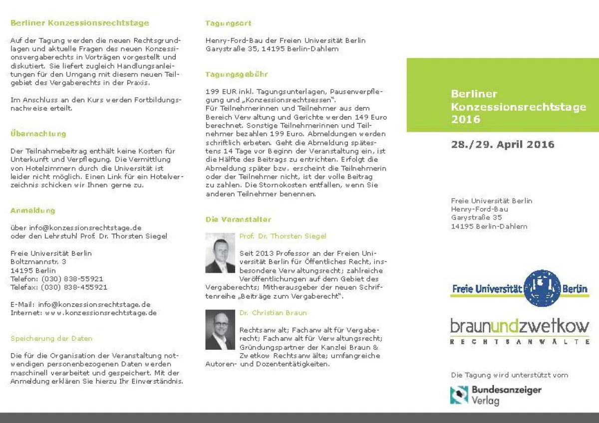 … der Freien Universität Berlin unter der Leitung von Prof. Dr. Thors-ten Siegel (Freie Universität Berlin) und dem Unterzeichner zum dritten Mal die Berliner Konzessionsrechtstage statt. Es ist die wissenschaftliche Fachtagung zur Vergabe von Bau- und Dienstleistungs-konzessionen.