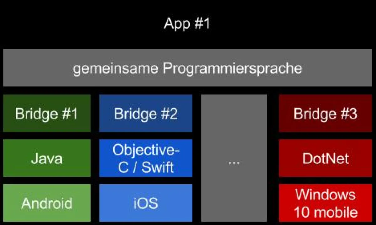 Crossplatform Apps laufen in einer Art Container auf dem jeweiligen Betriebssystem. Die Programmierung erfolgt in einer gemeinsamen Sprache für alle Betriebssysteme. Theoretisch muss damit nur einmal programmiert werden und die App läuft ohne weitere Anpassungen sofort auf verschiedenen Betriebssystemen. Meist erfolgt die Programmierung in Javascript. Es sind aber auch andere gemeinsame Sprachen möglich wie C#, Mono oder C++. Crossplatform-Frameworks wie beispielsweise Xamarin, Cordova, QT, React Native oder Phonegap erleichtern Entwicklern dabei den gemeinsame Quellcode auf die Schnittstellen des jeweiligen Betriebssystems weiter zu leiten. „Die Technologien für Crossplatform Apps sind aktuell stark im Wandel. Es erscheinen laufend neue Frameworks und Ansätze um Apps für verschiedene Plattformen zu entwickeln. Viele Frameworks sind noch im Anfangsstadium oder die Entwicklung schläft über die Zeit ein. Einen klaren Sieger bzw. "das beste Framework" ist aktuell noch nicht zu erkennen“, so Füllemann.