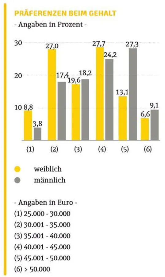 Betrachtet man aber die Gehaltsvorstellungen der weiblichen und männlichen Studienteilnehmer, stößt man auf interessante Aspekte. Auf den ersten Blick fällt auf, dass sich grundsätzlich mehr Frauen in den niedrigeren Gehaltssparten einordnen als Männer. Der Großteil der Frauen wünscht sich demnach eine Bezahlung zwischen 30.001 und 45.000 €. Während die meisten Männer sich erst ab einem Gehalt von 40.001 € zufrieden geben würde. Dieser Ausschnitt der Studie spiegelt ein momentanes Problem auf dem Arbeitsmarkt wider: Die Gehaltsunterschiede! Ein aktuelles Thema, das sich auch hier eindeutig abzeichnet.
