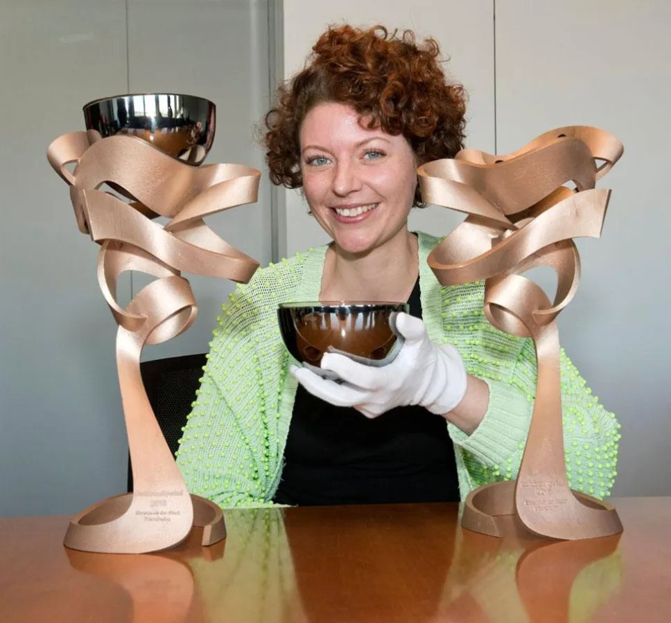 Ausgehend von den fließenden Bewegungen des Tanzes konzipierte Franziska Vogt ihren Entwurf des Goldstadtpokals. Zusammen mit ihrem Studienkollegen Felix Christmann nutzte sie das Training der Tanzschule Schwarz-Weiß, um die tänzerischen Bewegungen mit einer speziellen Kamera (3D Kintec) einzufangen. Diese Aufnahmen übertrugen sie mit einem selbst erstellten Programm in eine mehrdimensionale Form. „Franziska Vogt verknüpfte Tanz und Trophäe in hervorragender Weise“, urteilte die Jury und lobte für die künftige Schmuckdesignerin den ersten Preis aus. „Der sensible und kluge Einsatz von neuer Technologie setzt ein zeitgemäßes Zeichen“, erklärte Christine Lüdeke.