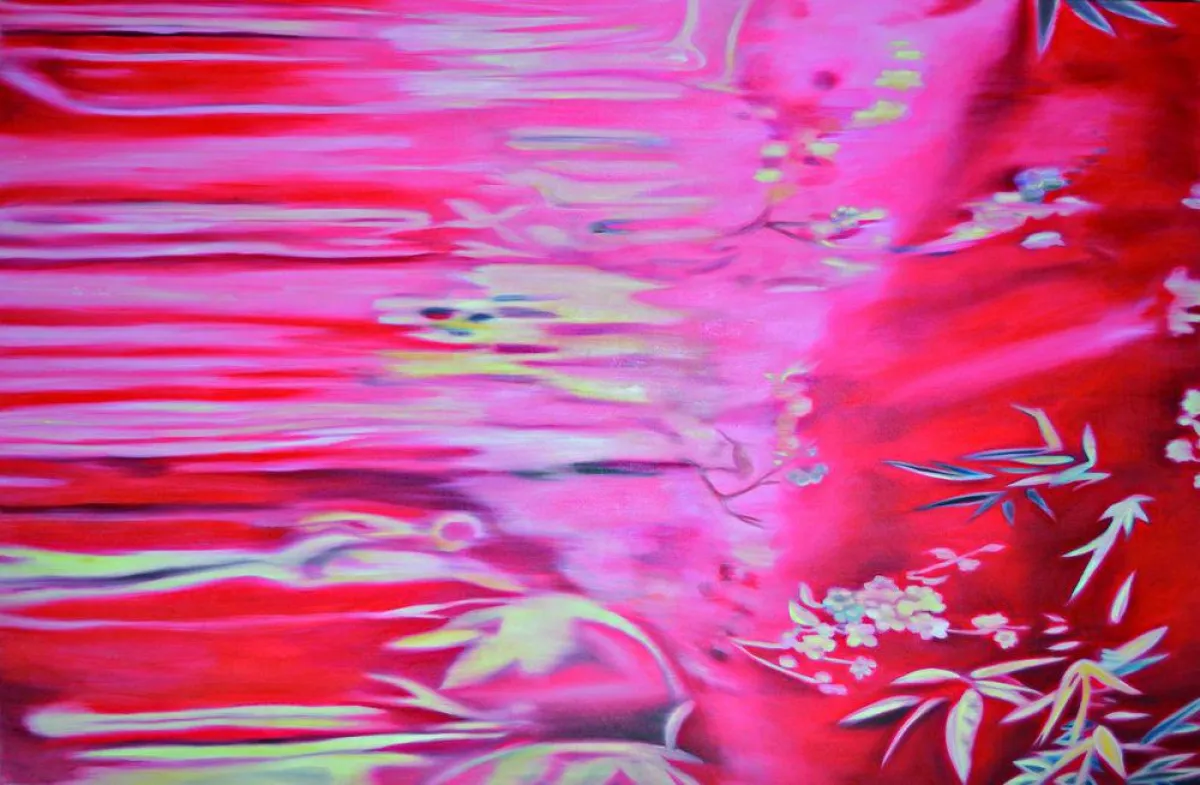•China moves - Ein Ölgemälde, das dem Motiv des Stoffes gewidmet ist. Explizit für den Messeauftritt wurde eine spezielle Mechanik entworfen und umgesetzt. Diese ermöglicht, dass das Gemälde in zeitlichem Abstand ca. 20 cm von der Wand fällt und wieder in die Hängeposition gezogen wird.