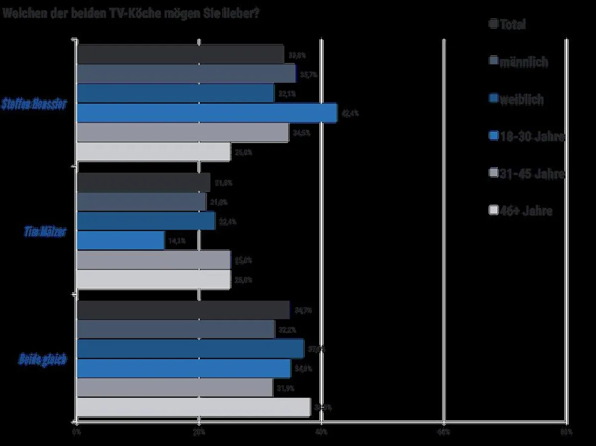 Das Ergebnis: Steffen Henssler hat in allen Kategorien die Nase vorn. 33,8 Prozent der Befragten gaben an, den Sushi-Profi lieber zu mögen – für Mälzer votierten hingegen nur 21,8 Prozent, während ein großer Teil (34,7 %) beide gleich gerne mag. Besonders beliebt ist Henssler bei den 18-30-Jährigen (42,4 %). Unentschieden (beide 25 %) ist das Ergebnis bei den Deutschen über 46 Jahren.