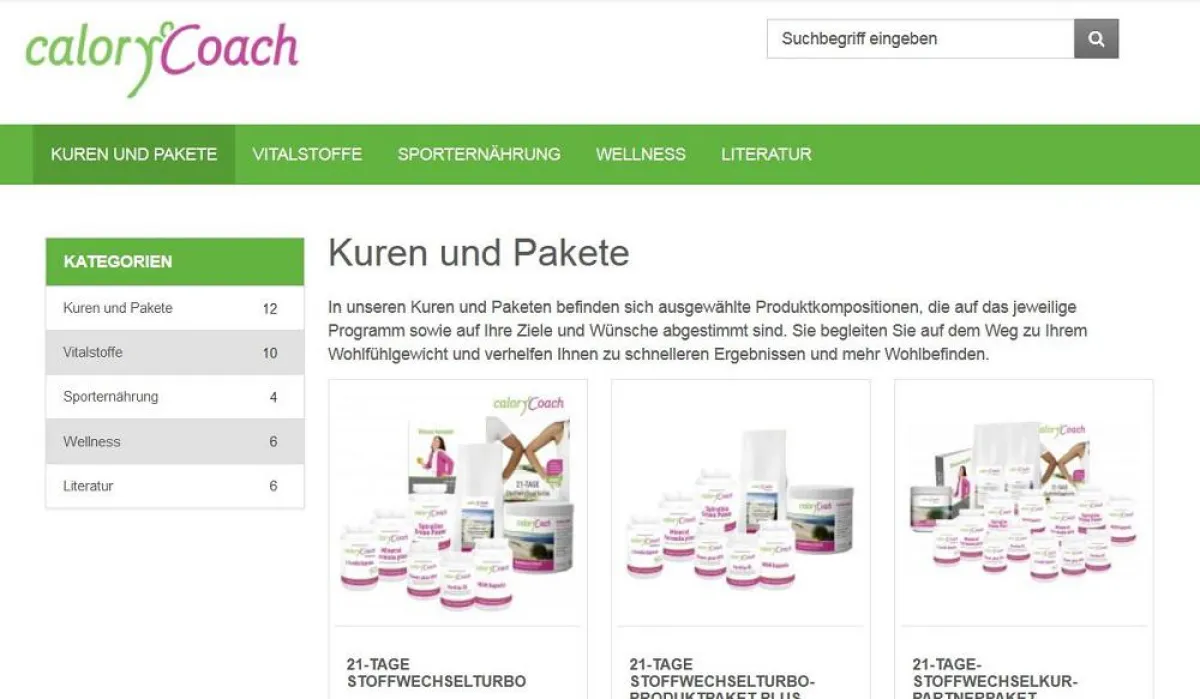 Alle Artikel kamen zuvor in den CaloryCoach-Instituten und in Partnerstudios zum Einsatz. Und das mit großen Erfolg: Bereits Tausende Kunden haben mit den Stoffwechselprogrammen wie MetabolicBoost, dem 21-Tage-Stoffwechselturbo oder KiloCRASH bis zu 12 Kg verloren. Auf der Startseite finden Interessierte besonders beliebte Produkte wie den 21-Tage-Stoffwechselturbo oder die L-Carnitin-Kapseln. Zusätzlich erhalten sie mit einem Klick auf die Hauptnavigationspunkte übersichtlich ihre Wunschartikel.