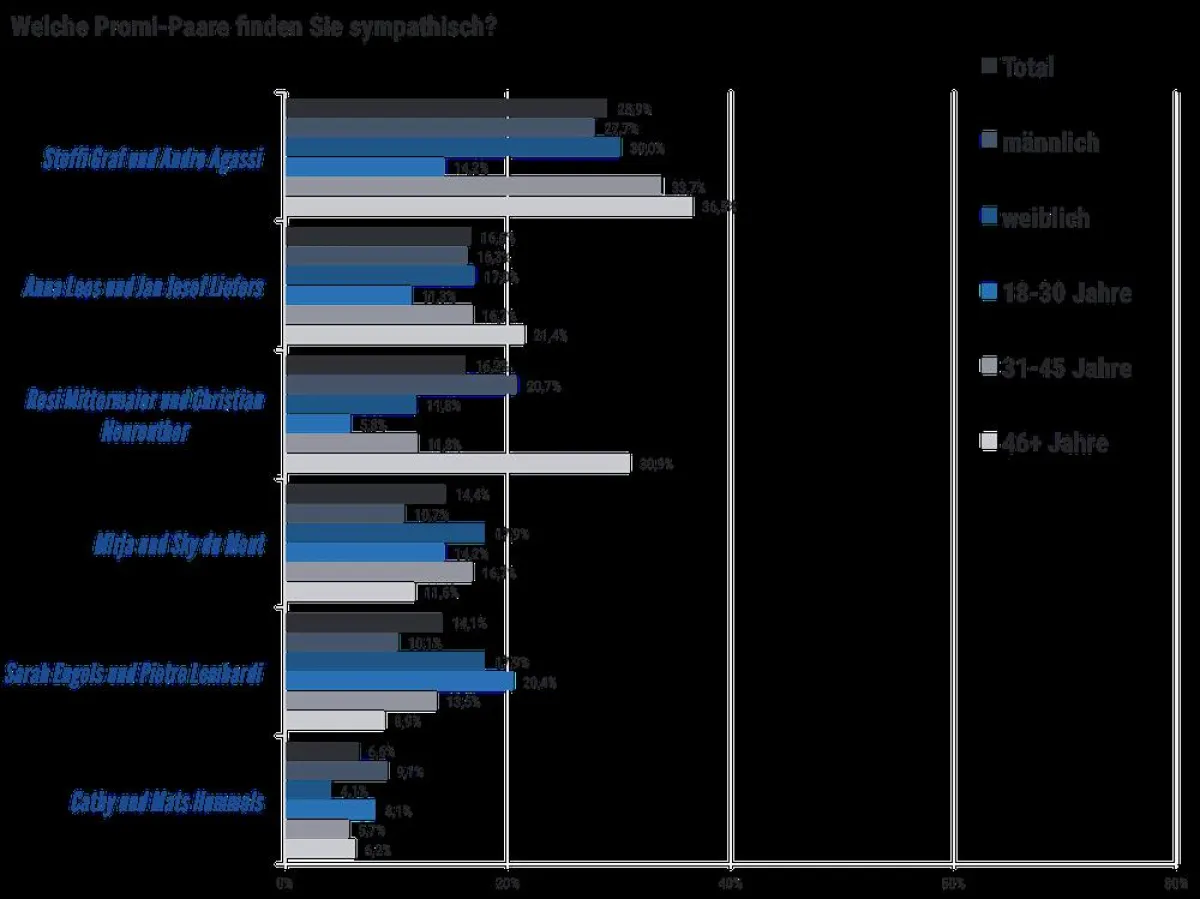 Die ganz klare Nummer 1 ist das Ehepaar Steffi Graf und Andre Agassi. Die beiden ehemaligen Tennis-Weltstars haben es bei 28,9 Prozent in die Herzen der Befragten geschafft. Besonders bei den Frauen über 46 Jahren (42,9 %) kommt das weltweit berühmte Pärchen sehr sympathisch rüber.