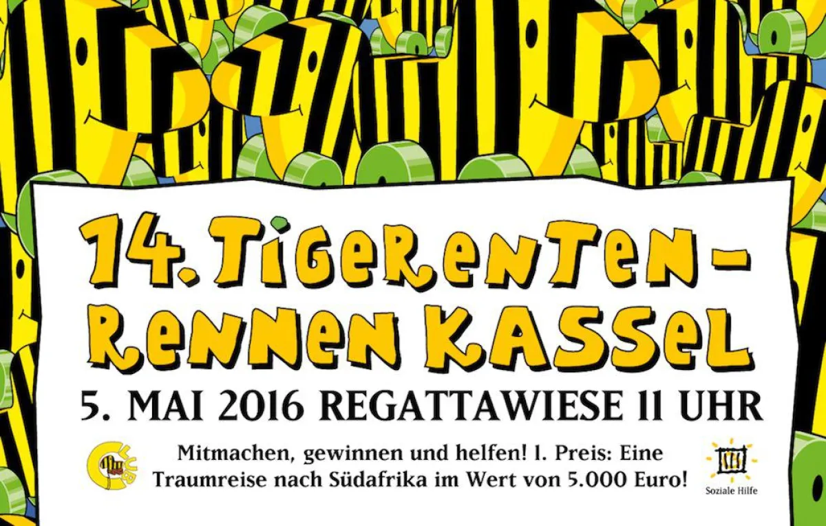 Das Tigerentenrennen selbst muss nicht mehr weitschweifig erklärt werden. Deshalb hier nur in aller Kürze: Kasseler Bürger adoptieren Tigerenten an den bekannten Vorverkaufsstellen, die am 05. Mai auf der Fulda zu Wasser gelassen werden. Diejenigen Enten, die am schnellsten ins Ziel schwimmen, bescheren ihren Adoptiveltern tolle Gewinne – die Krönung ist dieses Jahr eine Reise nach Südafrika im Wert von 5.000 Euro. Umrahmt wird das Ganze mit einem bunten Programm aus Musik, Tanz und kulinarischen Leckerbissen.