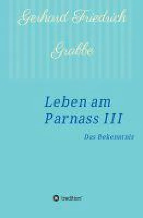 "Leben am Parnass III - Das Bekenntnis" von Gerhard Friedrich Grabbe ist ab sofort im tredition Verlag oder alternativ unter der ISBN 978-3-7345-1025-0 zu bestellen. Der tredition Verlag hat es sich zum wichtigsten Ziel gesetzt, jungen und unbekannten Autoren die Veröffentlichung eigener Bücher zu ermöglichen, aber auch Verlagen und Verlegern eine Kooperation anzubieten. tredition veröffentlicht Bücher in allen Medientypen, vertreibt im gesamten Buchhandel und vermarktet Bücher seit Oktober 2012 auch aktiv.