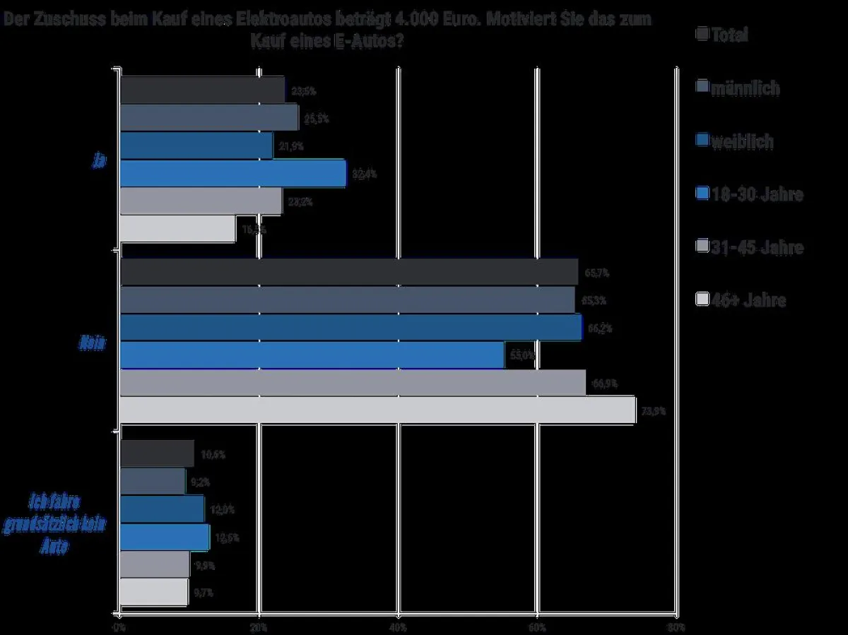 Das Ergebnis: Für etwa jeden vierten der Befragten ist der Zuschuss tatsächlich eine Motivation, sich das nächste Mal für ein E-Auto zu entscheiden. Was bei der Studie deutlich wird ist, dass sich vor allem die jüngeren Teilnehmer der Studie zwischen 18 und 30 Jahren von dem Angebot locken lassen. In dieser Altersgruppe sehen mit insgesamt 32,4 Prozent der Stimmen in dem Zuschuss deutlich mehr Befragte eine Motivation, als das bei den 31-45-Jährigen (23,2 %) oder bei den über 46-Jährigen (16,5 %) der Fall ist.