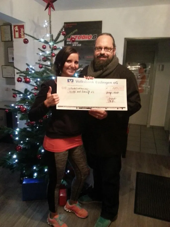 Bianco Hoh vom Studio 8 und Torsten Boorberg anläßlich der Scheckübergabe für „Kinder sind Zukunft“ in Vöhringen Weihnachten 2015.