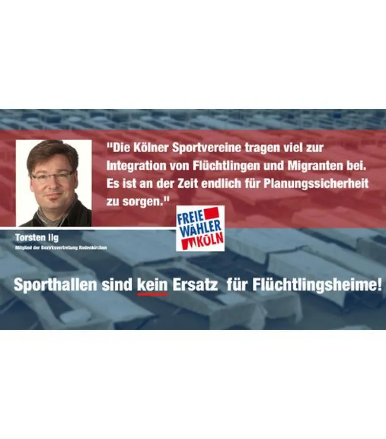 (openPR) (Köln / Rodenkirchen) Die FREIEN WÄHLERN beantragen in der Juni-Sitzung der Bezirksvertretung von Rodenkirchen Sofortmaßnahmen zur Unterstützung der Sportvereine in Köln. Bezirksvertreter Torsten Ilg kritisiert die lange Hallenbelegung durch Flüchtlinge: „Die Kölner Sportvereine werden viel zu lange im Regen stehen gelassen. Es gibt kein verbindliches Konzept zum Freizug der Hallen und somit keine Planungssicherheit für die Vereine. Infolge des Ausfalls haben diese mit Austritten und der Verweigerung von Mitgliedsbeiträgen zu kämpfen“. Ilg nimmt dabei Bezug auf eine aktuelle Pressemitteilung des Stadtsportbund Köln, der u.a. das Fehlen von „Leichtbau-Hallen“ bemängelt. Laut Landessportbund haben die Vereine teilweise bis zu 30 Prozent ihrer Mitglieder verloren.