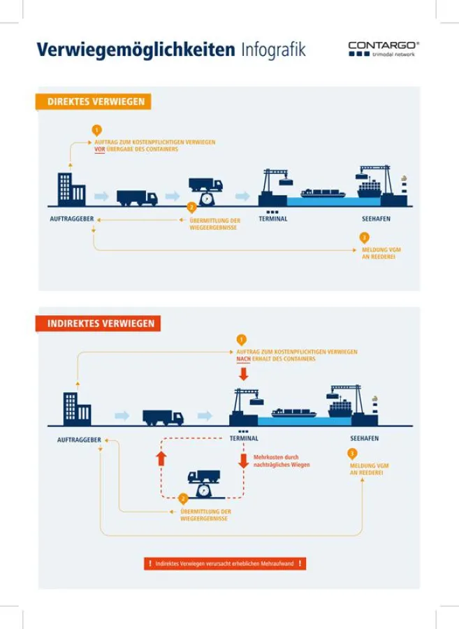 In der Preisliste für das Wiegen von Containern gibt Contargo daher zwei Preise an: Unter dem „direkten Verwiegen“ steht der Preis für die Lkw-An- und Abfahrt, wenn Contargo vorab der Auftrag für die Ermittlung des Bruttocontainergewichts erteilt wurde und unter „indirektes Verwiegen“ steht der Preis für das aufwändigere nachträgliche Wiegen.