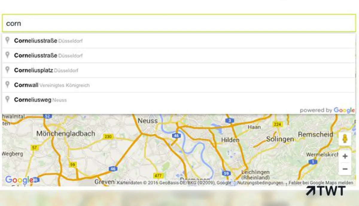 (openPR) TWT ermöglicht in Zusammenarbeit mit Google Maps eine korrekte Adressdaten-Eingabe durch eine innovative Adress-Autocomplete-Funktion. Ein intelligentes Eingabefeld ergänzt Adressdaten automatisch. Durch die hohe Usability bei dem Ausfüllen von Formulardaten verzeichnen Unternehmen weniger Abbrüche in der Buchungsstrecke und erhält validierte und korrekte Daten.