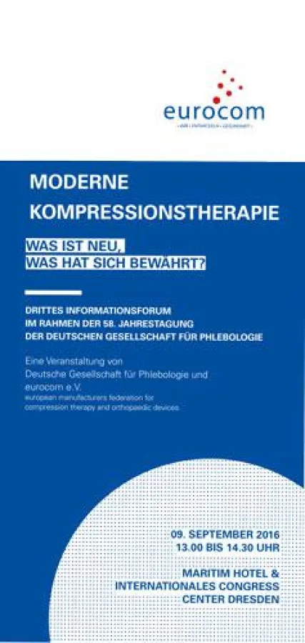 Zum dritten Mal laden der Industrieverband eurocom und die Deutsche Gesellschaft für Phlebologie (DGP) die Mitarbeiterinnen und Mitarbeiter in den Hilfsmittelteams der Krankenkassen und MDK´s sowie weitere Interessierte zu einem Informationsforum ein. Im Rahmen der diesjährigen Jahrestagung der DGP in Dresden findet in der Mittagszeit des 09. September 2016 das Kassenforum mit dem Titel „Moderne Kompressionstherapie – Was ist neu, was hat sich bewährt?“ statt. eurocom und DGP wollen damit einerseits über neueste Entwicklungen in der Kompressionstherapie informieren, andererseits in einen Dialog mit den anderen am Versorgungsprozess der Versicherten Beteiligten eintreten. Ziel ist, gemeinsam die Behandlungssituation der Patienten zu verbessern.