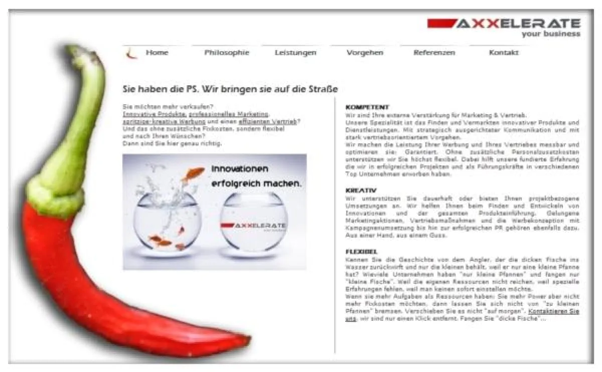 (openPR) Heidenheim, 28.06.06. Deutschland entwickelt sich immer stärker zum Wissensstandort. Wissen muss jedoch auch zu Innovationen führen und Innovationen müssen erfolgreich vermarktet werden. Um dieser Wertschöpfungskette gerecht zu werden, hat nun die Marketingberatung und Werbeagentur Axxelerate ihr Angebot überarbeitet. Auf der neuen Website findet sich ab sofort ein umfassendes Informations- und Serviceangebot rund um die Themen: Innovative Produkte einführen, professionelles Marketing, spritzige kreative Werbung und effizienter Vertrieb. Über den Marketing Mix geht es zur Marketingberatung, Marketingstrategie, Positionierung und Werbung. Auch auf Themen wie Innovationsentwicklung, Public relations, Vertriebsaufbau, Vertriebsstrategie und Markteinführung von Innovationen wird eingegangen.