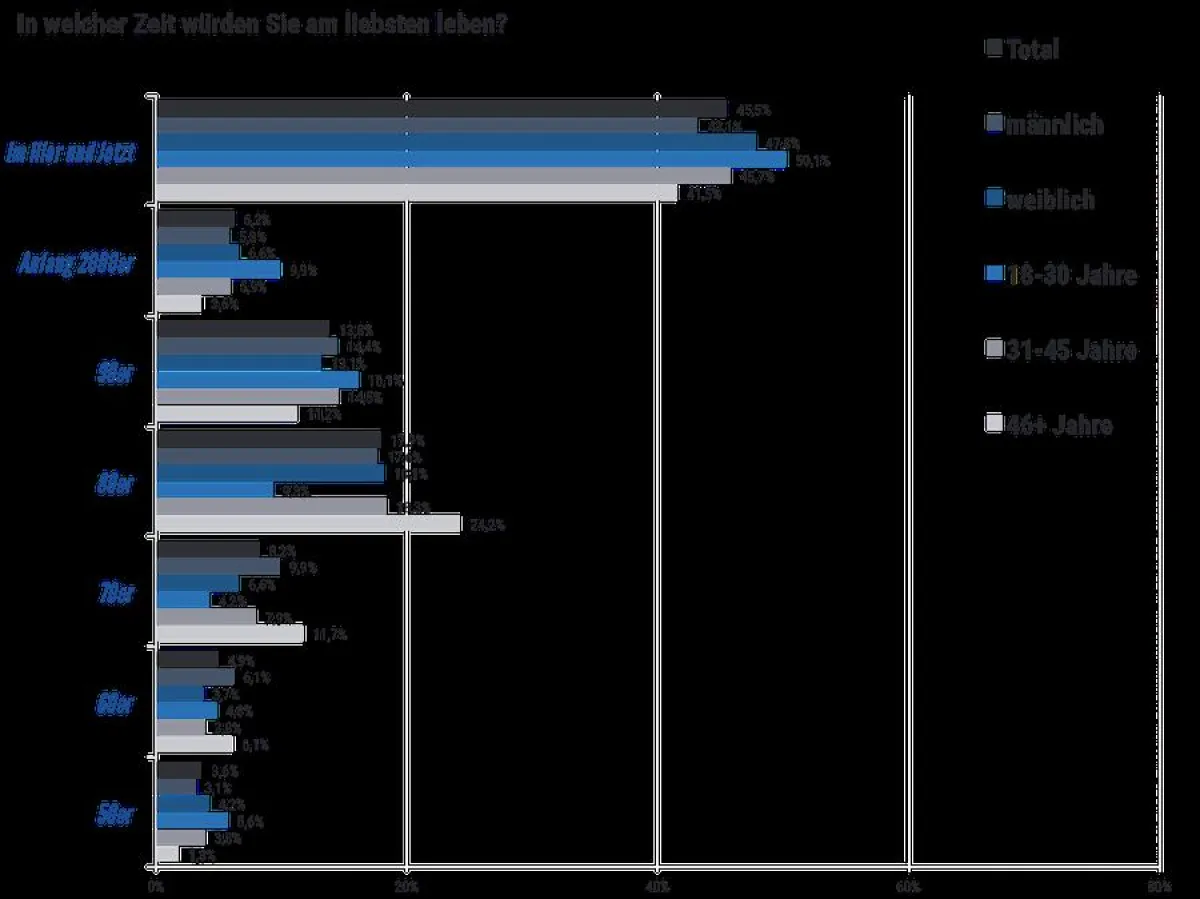 Das Ergebnis der Studie: 45,5 Prozent der Deutschen würden sich tatsächlich für das Hier und Jetzt entscheiden. Sowohl Männer (43,1 %) als auch Frauen (47,8 %) fühlen sich in der heutigen Zeit offenbar sehr wohl und möchten sie nicht mit einem vergangenen Jahrzehnt tauschen. Selbst die älteren Befragten ab 46 Jahren entschieden sich noch mit 41,5 Prozent der Stimmen für das Hier und Jetzt.