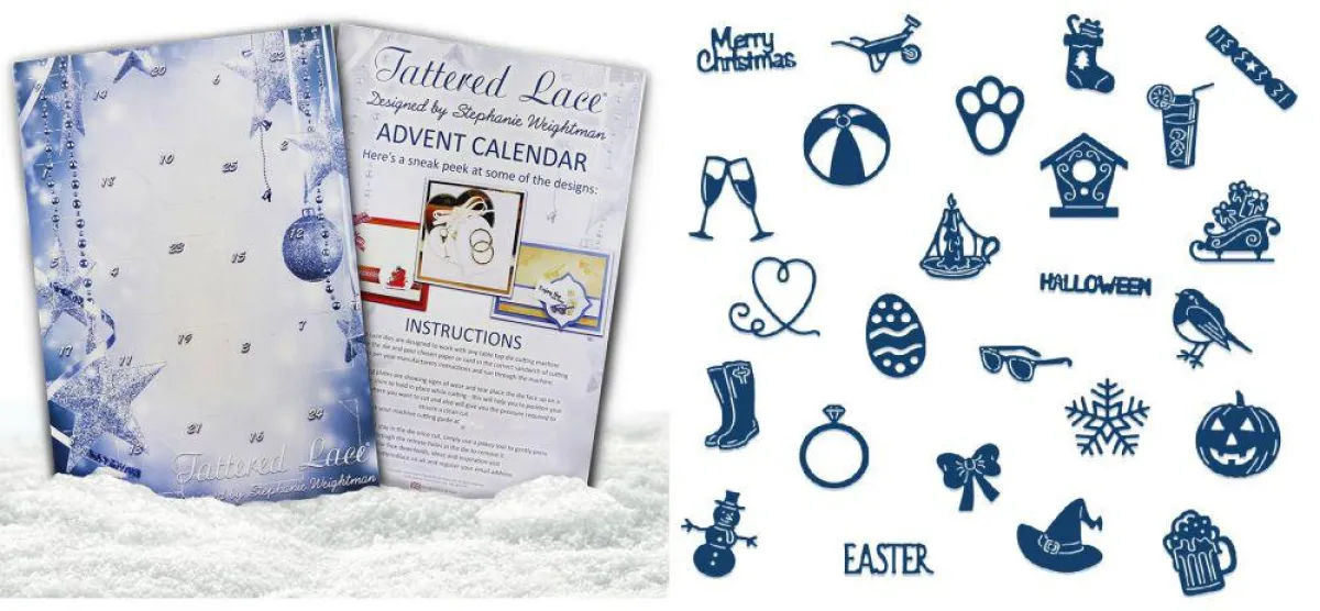 Der erste „Tattered Lace“ Adventskalender. 25 Türchen und hinter jedem Türchen ist eine Original Mini Stanzschablone von Tattered Lace die es so nie im Handel geben wird. Außerdem erhalten sie kostenlos eine Anleitung zum Download mit vielen Beispielen was sie gestalten können.