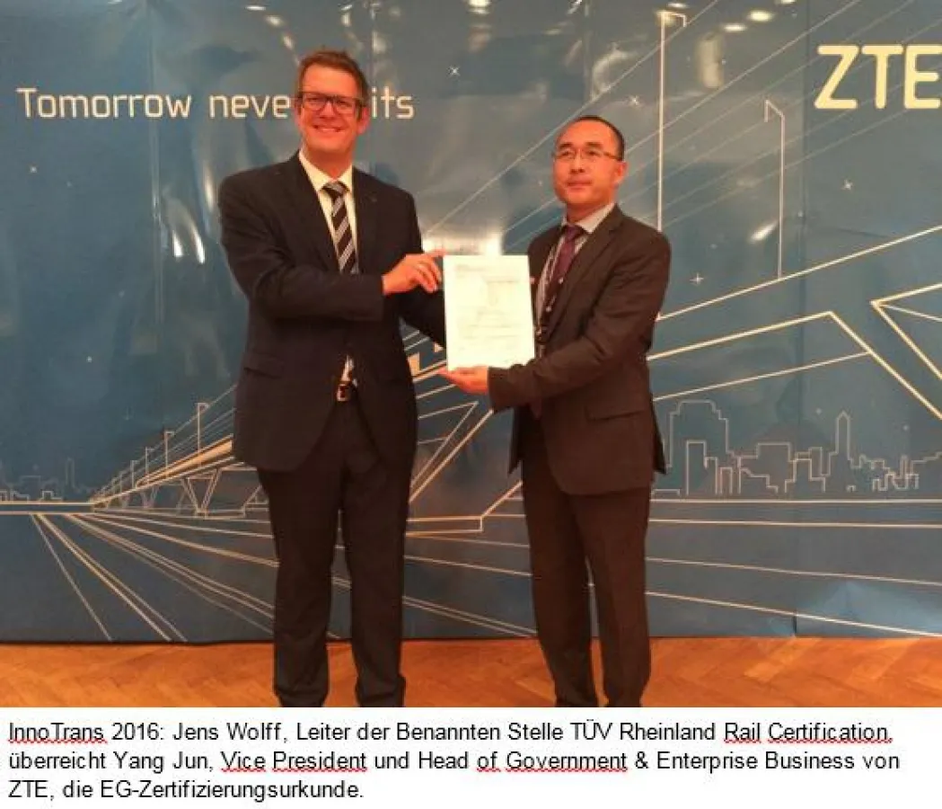 InnoTrans, Berlin, 22. September 2016 – TÜV Rheinland hat dem Telekommunikationsunternehmen ZTE auf der InnoTrans 2016, der internationalen Leitmesse für Verkehrstechnik (20. - 23. September, Berlin), EG-Zertifizierungen für sein SDR-basiertes GSM-R System der neuen Generation erteilt. Damit wird nachgewiesen, dass die neueste GSM-R Netztechnologie von ZTE alle Anforderungen der EG-Verifizierung nach Prüfung durch TÜV Rheinland erfolgreich bestanden hat. TÜV Rheinland ist ein weltweit führender Anbieter von Gutachter- und Zertifizierungsleistungen.