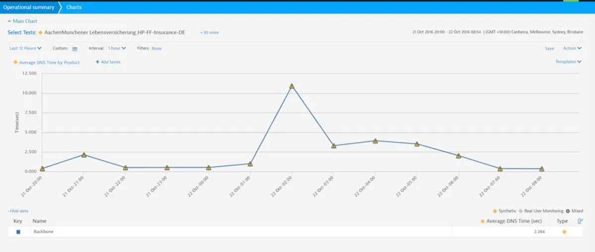 Die durchschnittliche DNS-Verbindungszeit im Verlaufe des 22. Oktober bei der Aachen-Münchener Lebensversicherung zeigt einen deutlichen Anstieg durch die aktuelle DDoS-Attacke auf den DNS-Anbieter Dyn.