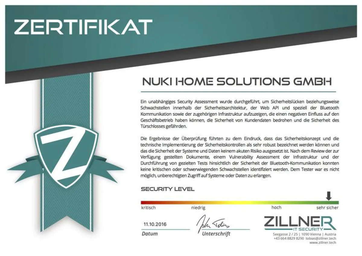 Graz, 22. November 2016 – Das Unternehmen Nuki hat einen unabhängigen Security-Test ihres Smart Locks durchführen lassen. Das derzeit europaweit einzige Smart Lock mit permanenter Internetverbindung wurde von dem international renommierten Sicherheitsforscher Tobias Zillner genauer unter die Lupe genommen. Ziel des Security Assessment war es, Lücken innerhalb der Sicherheitsarchitektur zu identifizieren. Das Resümee ist mehr als zufriedenstellend: „Die Ergebnisse der Überprüfung führten zu dem Eindruck, dass das Sicherheitskonzept und die technische Implementierung der Sicherheitskontrollen als sehr robust bezeichnet werden können und dass die Sicherheit der Systeme und Daten keinem akuten Risiko ausgesetzt sind“, so Tobias Zillner.