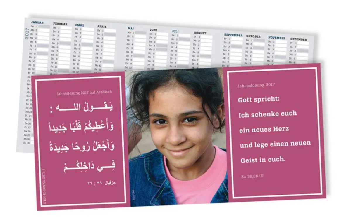 Unter www.die-bibel.de/fluechtlingsarbeit kann die zweisprachige Jahreslosung 2017 im Internet bestellt werden – oder per Mail an