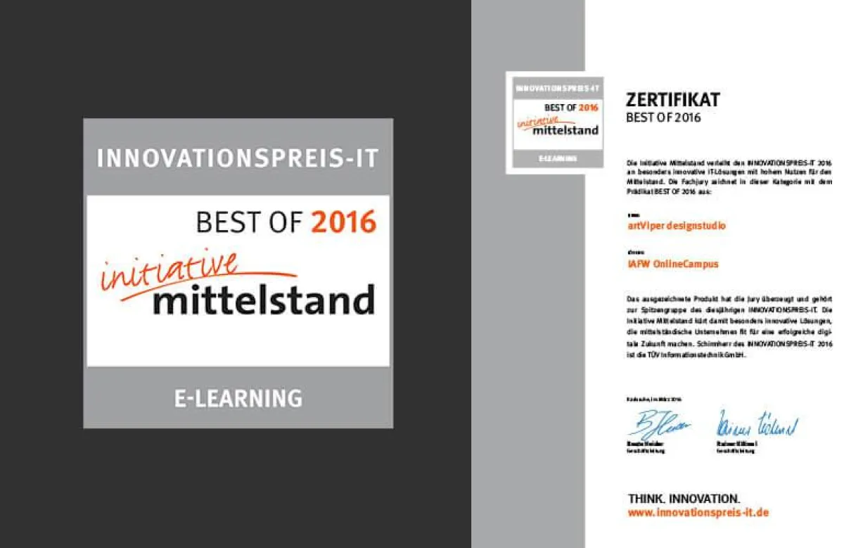 IAFW OnlineCampus: Lernen im Netzverbund. Auftraggeber und Anwender des ausgezeichneten Onlinesystems ist das Institut für Aus-, Fort- und Weiterbildung (IAFW) in Regensburg. Im April 2015 beauftragte das IAFW die Marketingagentur artViper mit der Konzeption und Umsetzung eines Lernsystems, das Studierende, Lehrkräfte und Praxisanleiter innerhalb der beteiligten Ausbildungsbetriebe und Kliniken vernetzt. Kernstück des Systems ist der IAFW OnlineCampus, bei dessen Konzeption Flexibilität und Nutzerfreundlichkeit im Vordergrund standen. Das Ziel, eine Plattform zu schaffen, deren Benutzung nicht nur das Lernen und den Austausch ermöglicht, sondern auch Spaß macht, ist dem Team aus Weiden offensichtlich gelungen: Das zeigt die Begeisterung der mehr als 100 Fachjuroren, die das Projekt im März 2016 als besonders innovative IT-Lösung für den Mittelstand zertifizierten.
