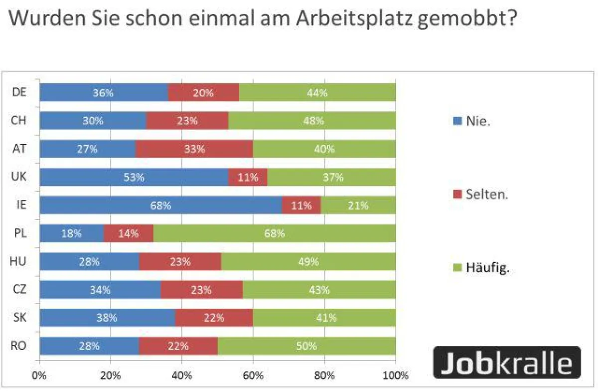 (openPR) Mobbing kann in fast allen Lebensbereichen vorkommen und betroffene Personen sowohl psychisch als auch physisch stark belasten. Heutzutage ist auch die Arbeitswelt intensiv von diesem Problem betroffen. Die Jobsuchmaschine Jobkralle / Jobswype fragte ihre User in einer Umfrage deshalb, ob sie schon einmal Opfer von Mobbing am Arbeitsplatz gewesen seien. Es stellte sich heraus, dass sich in den meisten Ländern, in denen Jobkralle aktiv ist, zwischen 60-80 % der Befragten manchmal oder sogar häufig am Arbeitsplatz gemobbt gefühlt haben.