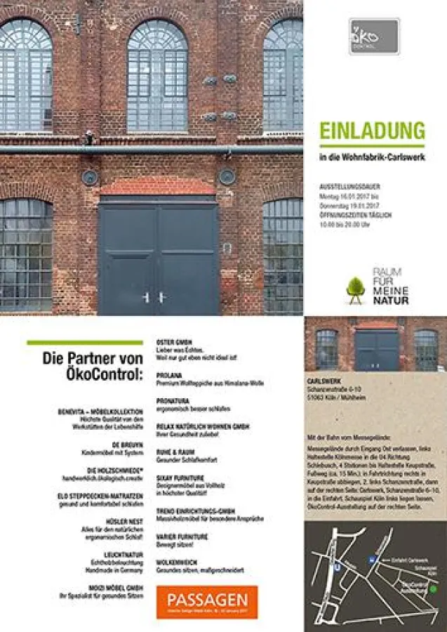 Die ÖkoControl Ausstellung „Raum für meine Natur“ im Carlswerk in der Schanzenstraße 6-10, Köln Mülheim, ist vom 16. –19.01.2017 jeweils von 10 bis 20 Uhr geöffnet. Während dieser Zeit sind Hersteller und Verbandsleitung für Informationen aller Art vor Ort.