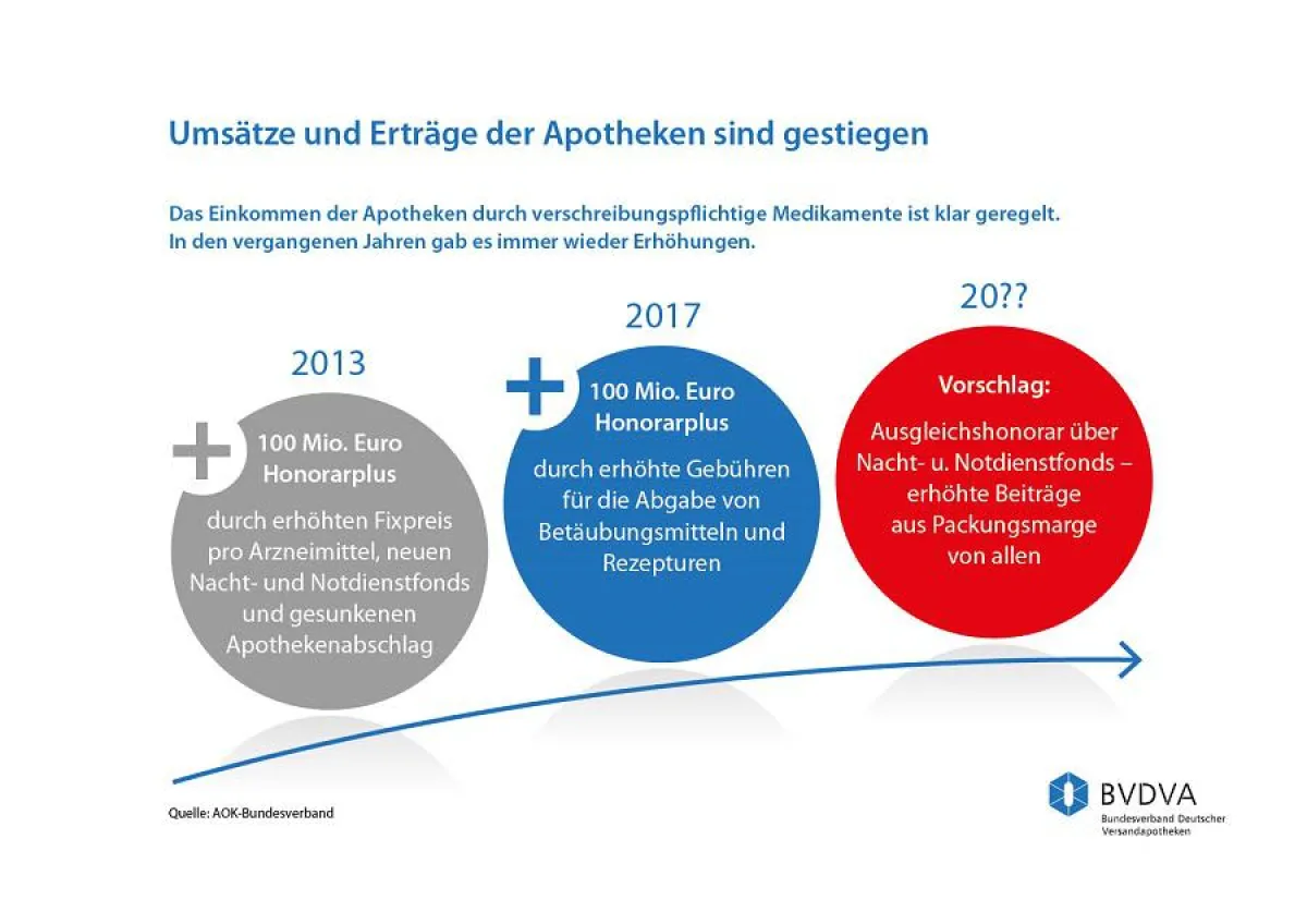 Dennoch, es steigt regelmäßig: Allein 2013 stiegen die Honorare um über 100 Mio. Euro durch die Erhöhung des Festpreises um 25 Cent, die Reduzierung des Kassenabschlags auf heute 1,77 Euro und die Einführung des Nacht- u. Notdienstfonds.
