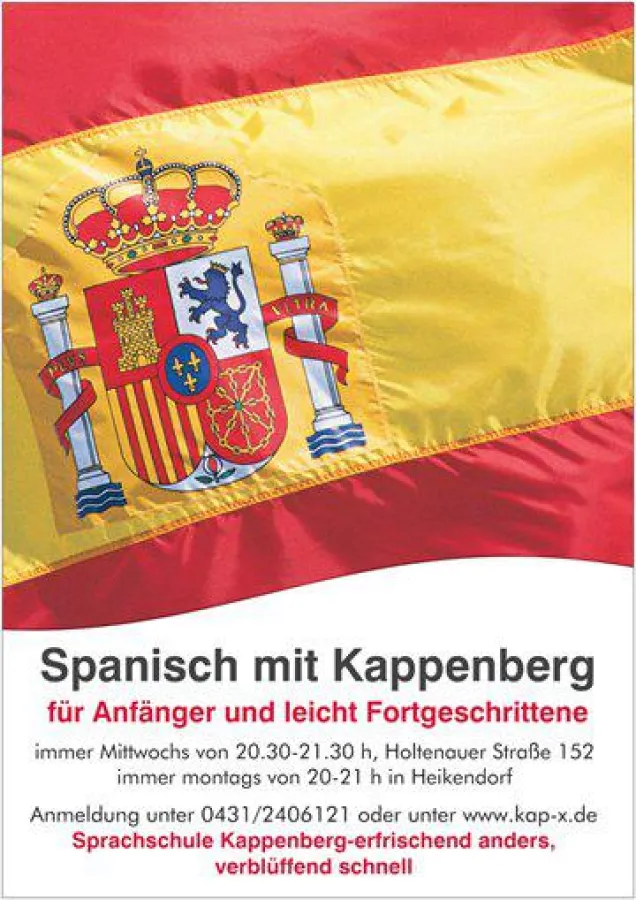 (openPR) Jeden Mittwoch zwischen 20.30 und 21.30 Uhr entspannt in einer kleinen Runde Spanisch lernen - das ist im neuen Spanischkurs für Anfänger, leicht Fortgeschrittene und Wiedereinsteiger der Sprachschule Kappenberg in Kiel möglich. Eingeladen sind alle, die noch keine oder leichte Spanischkenntnisse haben und diese in lockeren Gesprächen und Diskussionen lernen und entfalten möchten.