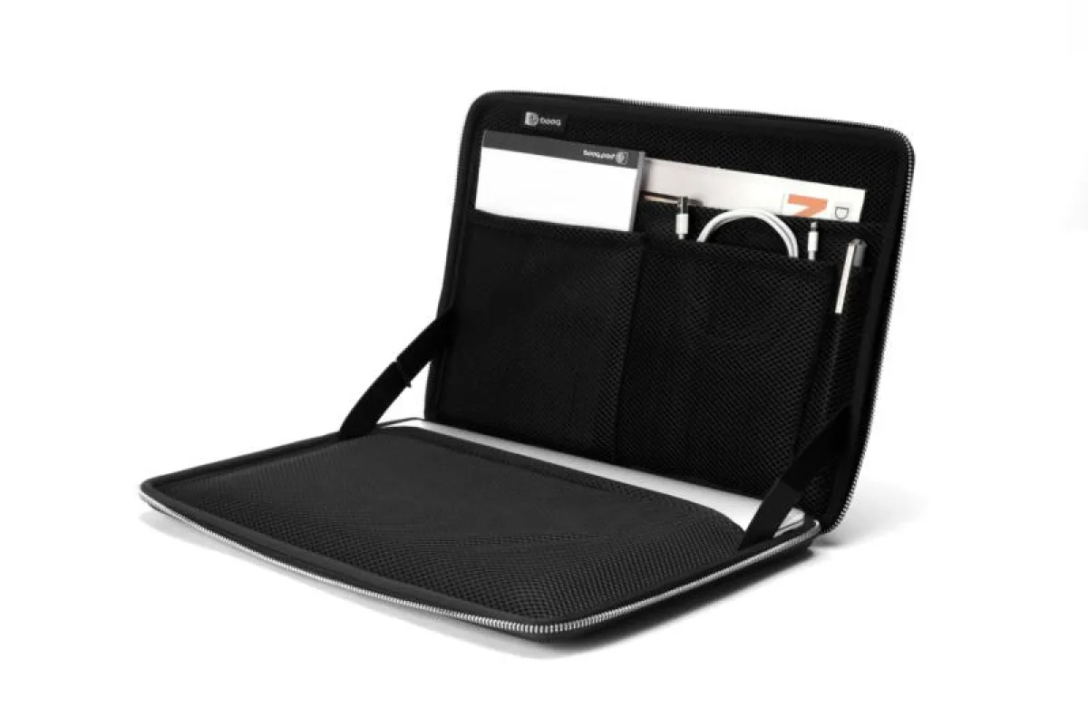 Ob im Zug oder im Café – das clevere Hardcase wird aufgeklappt zum Mini-Schreibtisch und ermöglicht so komfortables Arbeiten am Mac auch auf kleinstem Raum. Dank extra dicker Schaumstoffpolsterung liegt das neue MacBook Pro im Hardcase aus hochwertigem Ballistic Nylon rundum sicher geschützt vor Kratzern, Erschütterungen oder Feuchtigkeit. Weiches Jersey-Futter bietet zusätzlichen Schutz, die hochwertigen YKK-Reißverschlüsse sind mit einer Gummilippe versehen, sodass sie keine Kratzer verursachen können. Besonders praktisch: Auch für nützliches Zubehör wie Smartphone oder Kabel findet sich ein Platz in der minimalistisch designten Hülle. In passenden Unterteilungen lassen sich kleine Accessoires ordentlich verstauen.