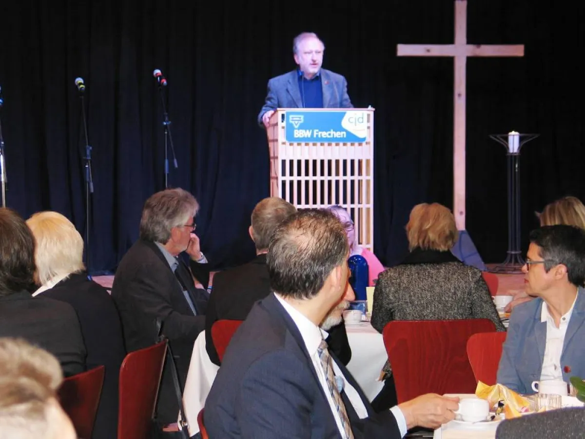 Zu den liturgischen Elementen gehören neben Besinnung, Gesang und Fürbitten auch viel Zeit für Gespräche, Frühstücken sowie der Vortrag eines Ehrengastes. Der diesjährige Ehrengast Dr. Horst Röhr, der auch noch als Rentner, eine Beratungsstelle für Begabungsförderung und Hochbegabung im CJD Dortmund leitet, sprach zum Thema 70 Jahre CJD, 40 Jahre CJD Frechen und 10 Jahre Gebetsfrühstück im CJD Frechen, denn gleich drei Jubiläen werden in diesem Jahr gefeiert.