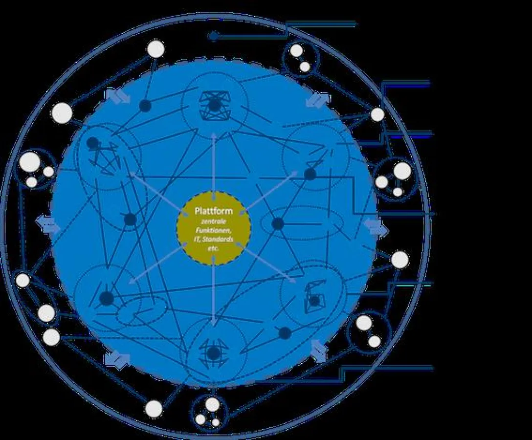 3. Die Vernetzung der Kreise untereinander und mit der Plattform ähnelt dem Aufbau einer Netzwerkorganisation. Der kontinuierliche Wissensaustausch ist essentiell, um Erkenntnisse über Markt und Kunden, neue Ideen und Ergebnisse schnell auszutauschen und organisationales Lernen zu ermöglichen.
