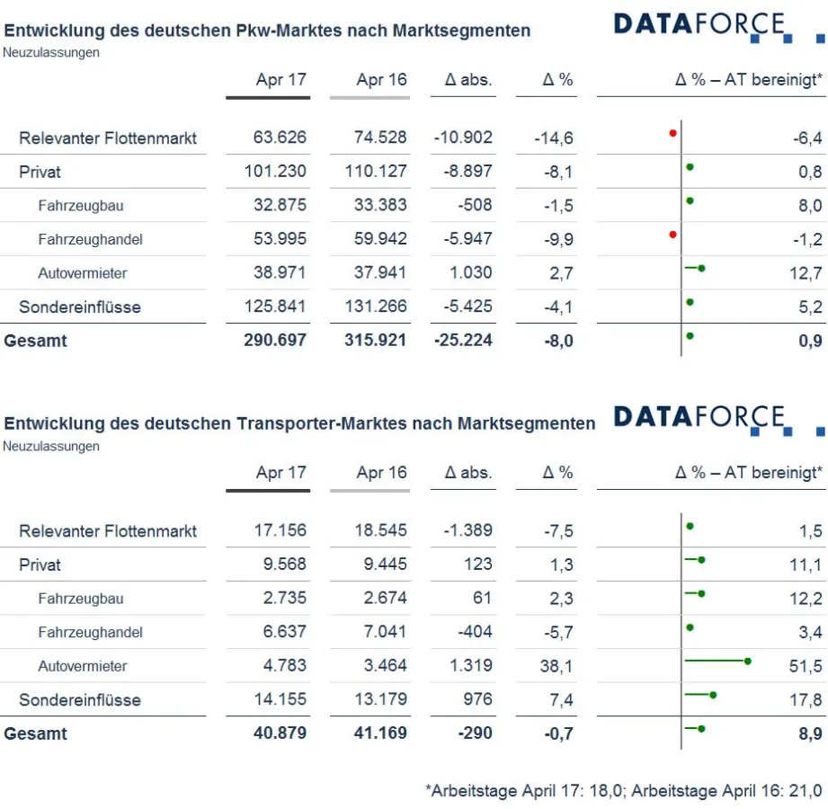 (openPR) Die Dataforce-Analyse der Pkw- und Transporter-Neuzulassungen für April 2017 zeigt den deutlichen Einfluss der Osterfeiertage. Trotz eines nominellen Rückgangs bleibt der Ausblick vielversprechend. Große Unterschiede ergeben sich zwischen den betrachteten Marktsegmenten. Die Erholung im Privatmarkt hält an, obwohl auch die taktischen Zulassungen weiter zunehmen. Dagegen gelingt es dem Relevanten Flottenmarkt im März und April nicht mehr, das Rekordniveau des Vorjahres zu halten.