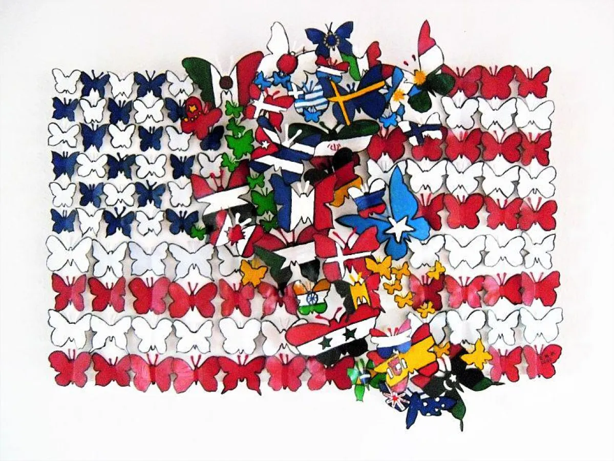 Das Bild mit der Größe von 85 x 65 cm soll die amerikanische Fahne darstellen, in deren Mitte viele unerwünschte und nicht kooperierende Staaten als Schmetterlinge frei und nicht zu stoppen über die USA hinwegfliegen.