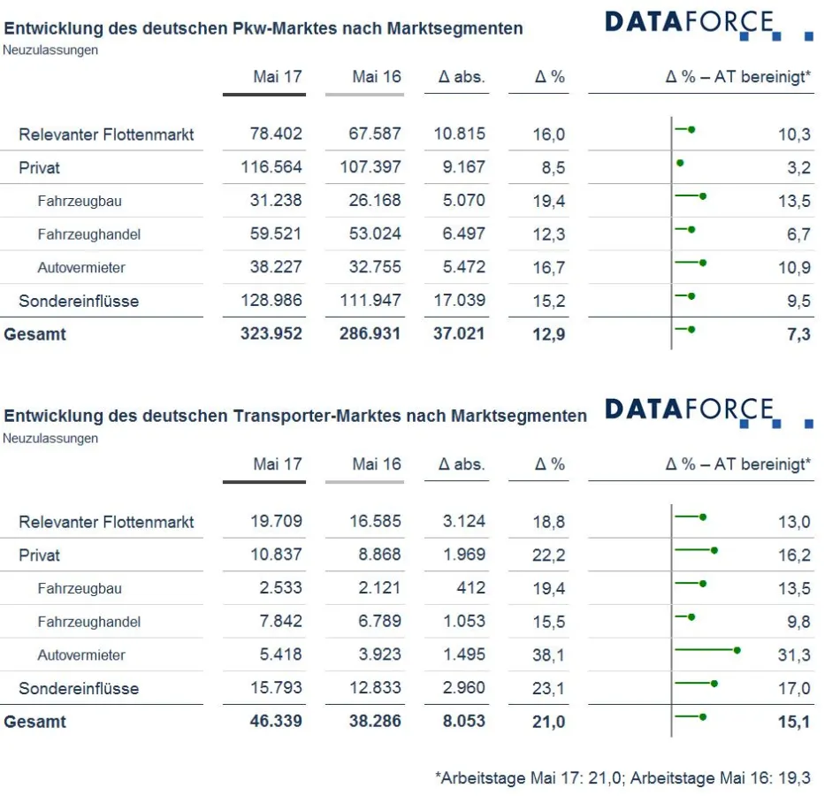 Das Wachstum im Transporter-Markt (leichte Nutzfahrzeuge und Pkw-Utilities) überschritt im Mai nominal die 20-Prozent-Marke und lag bereinigt bei 15,1 Prozent. Bei den bereinigten Wachstumsraten verfehlte der Fahrzeughandel mit 9,8 Prozent knapp ein zweistelliges Ergebnis, was in allen anderen Marktsegmenten gelang. Spitzenreiter beim Wachstum waren einmal mehr die Autovermieter, die arbeitstäglich bereinigt 31,3 Prozent mehr neue Transporter anmeldeten als im Mai 2016.
