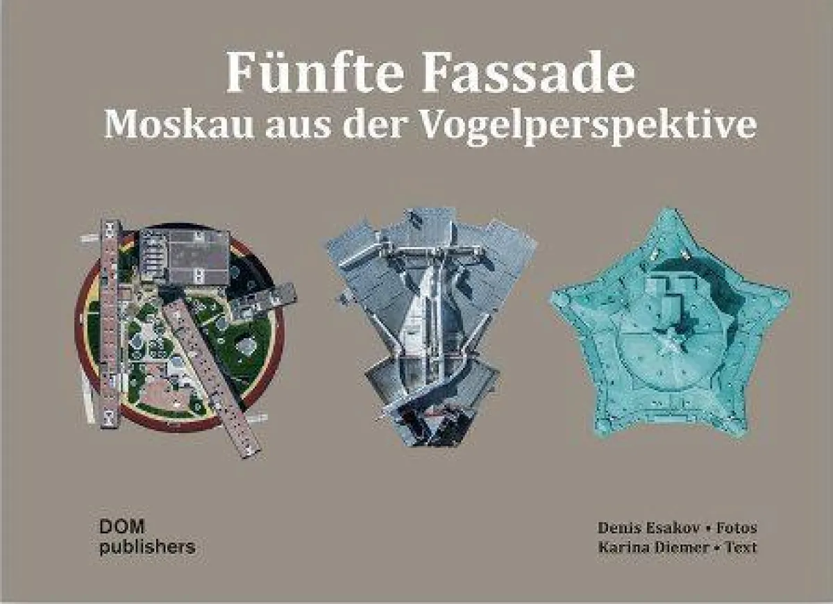 Der Moskauer Fotograf Denis Esakov hat mit einer Drohne die fünften Fassaden der größten Metropole Europas erfasst: Dächer, Kuppeln, auftürmende Gebäudekuben. In dem kleinen bibliophilen Bildband Fünfte Fassade – Moskau aus der Vogelperspektive portraitiert er auf diese Weise über 70 architektonisch bedeutende Objekte aus den vergangenen hundert Jahren. Spying on Moscow – so der englische Titel des dreisprachigen Bandes – ist der erste Bildband über Moskau mit Fotos, die von einer Drohne aufgenommen wurden. Von jedem Gebäude erzählt Esakov eine kleine, aus drei Bildern bestehende Geschichte. Zwei davon sind aus der Luft aufgenommen, das dritte präsentiert die Perspektive des ebenerdig stehenden Betrachters. So gewinnt man einen dreidimensionalen Gesamteindruck und kann die Sehenswürdigkeiten der Stadt mit neuem Blick – dem des Architekten aufs Modell – sehen. Eine solche Sichtweise hilft, die Wahrnehmung zu schulen und das Wesen der Gebäude aus drei Blickwinkeln zu erfassen. So erinnert etwa die hyperbolische Konstruktion des Schuchow-Radioturms (1922) von oben an ein Vogelnest, das berühmte „Wohngebäude der Regierung“ (1931) von Boris Iofan offenbart sich als komplexe Kom-position mit unterschiedlich großen Volumina und Innenhöfen, oder das Theater der Roten Armee (1940), das aus der Luft erkannt werden sollte, baut sich zum symbolträchtigen fünfzackigen Stern auf.