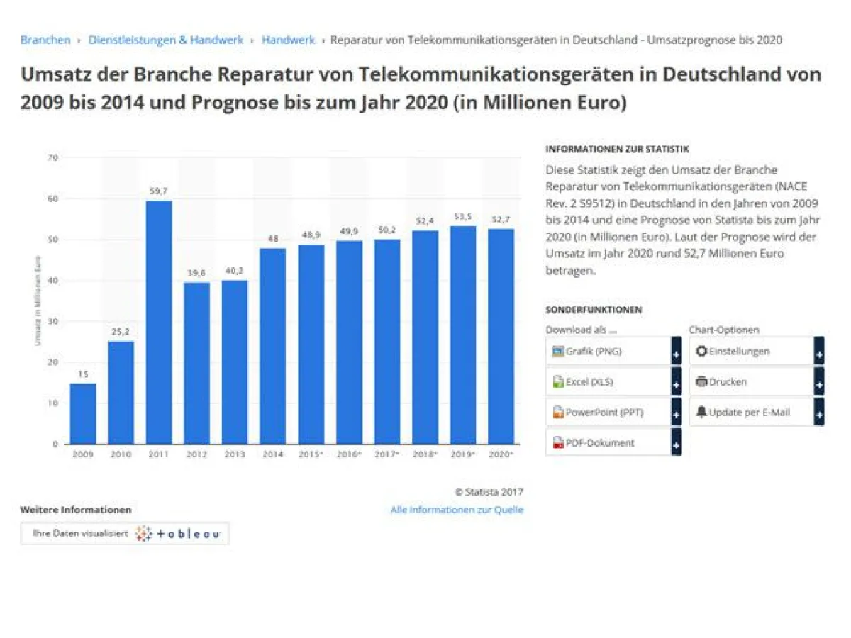 Kein Wunder also, dass die Umsätze in der Branche rund um die Reparatur von Telekommunikationsgeräten seit Jahren stetig ansteigen. Das Statistische Bundesamt prognostiziert für 2017 einen Gesamtumsatz in dieser Branche von
