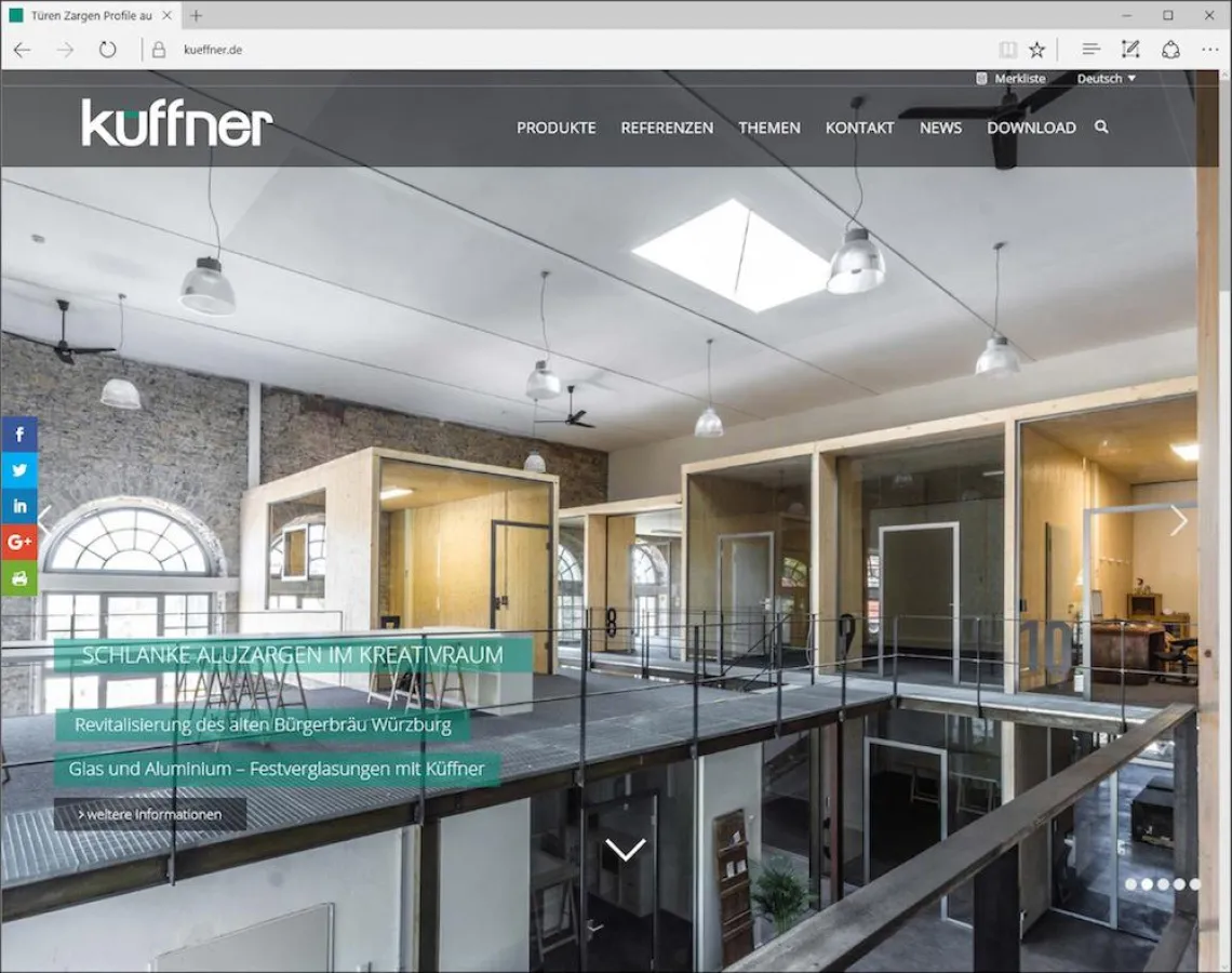 (openPR) Küffner hat seinen Internetauftritt komplett überarbeitet und neu strukturiert. Alle Funktionen sind jetzt noch stärker auf die Nutzer ausgerichtet und für jedes Endgerät optimiert. Ob für PC, Tablet oder Smartphone – die Darstellung aller Inhalte passt sich mediengerecht an. Hier sind neben einer kompletten Systemübersicht und Präsentation des umfangreichen Sortiments von Aluminiumzargen, Fingerschutztüren, Raumspartüren, Aluminium-Rahmentüren, Glasverbundelementen und allen weiteren Küffner Profilen auch hilfreiche Zeichnungen und Planungsunterstützung zu finden. Durch die neu konzipierte, interaktive Verbindung von Objektreferenzen mit integrierten Produktfiltern werden jetzt gezielt Anwendungslösungen vorgestellt.