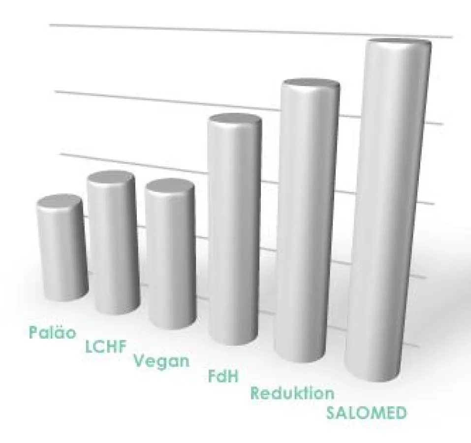 Übertroffen wird diese Diät allerdings noch vom SALOMED Konzept. Dieses beruht auf einer völligen Individualisierung der Ernährung bei gleichzeitigem Fehlen von Kalorien zählen und vorgegebenen Kochrezepten. Fast automatisch wird die Ernährungsweise von Grund auf umgestellt und das in fast spielerischer Weise. Mit dieser Herangehensweise trägt das SALOMED System als einzige der untersuchten Ernährungsformen der neuesten ernährungswissenschaftlichen Forderung nach völliger Individualisierung bzw. Personalisierung Rechnung.