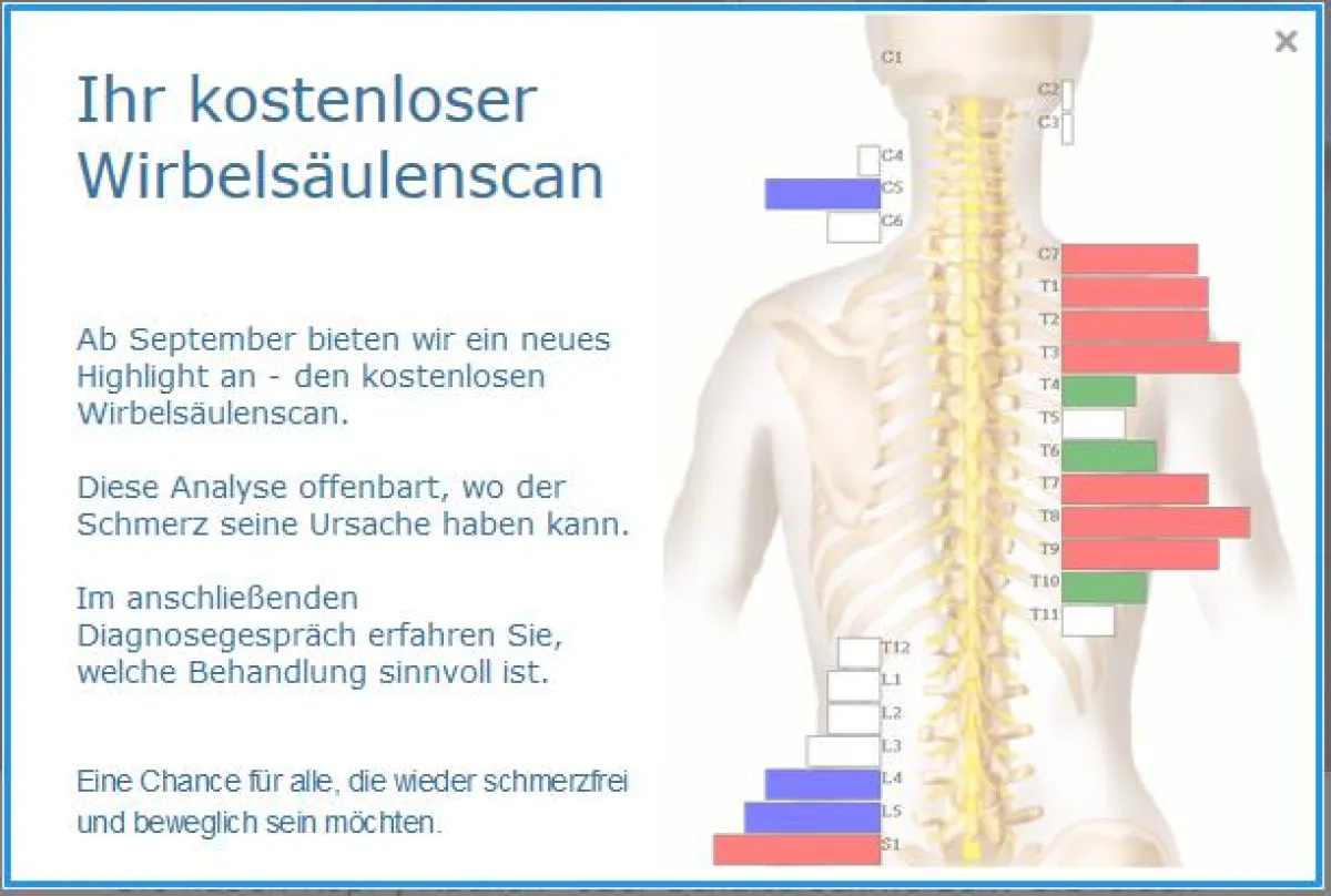 Am 05. und 06. Mai bieten wir erneut ein weiteres Highlight an - den kostenlosen Wirbelsäulenscan. Diese Analyse offenbart, wo der Schmerz seine Ursache haben kann. Im anschließenden Diagnosegespräch erfahren die Patienten welche Behandlung sinnvoll ist.